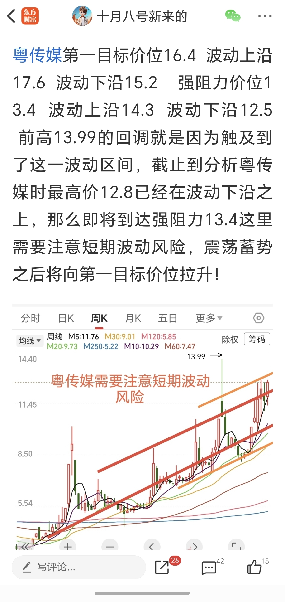 大家看一下我昨天对粤传媒的分析,我分享了强阻力价位13.4 昨天我写分析的时候股价最高12.8 尾盘涨停了我不知道,今天有股友问粤传媒怎么了,我一看 是这么回事!昨天涨停价13.23离13.4只差0.17元!我提示的注意短期波动风险对不对?是不是非常精准?