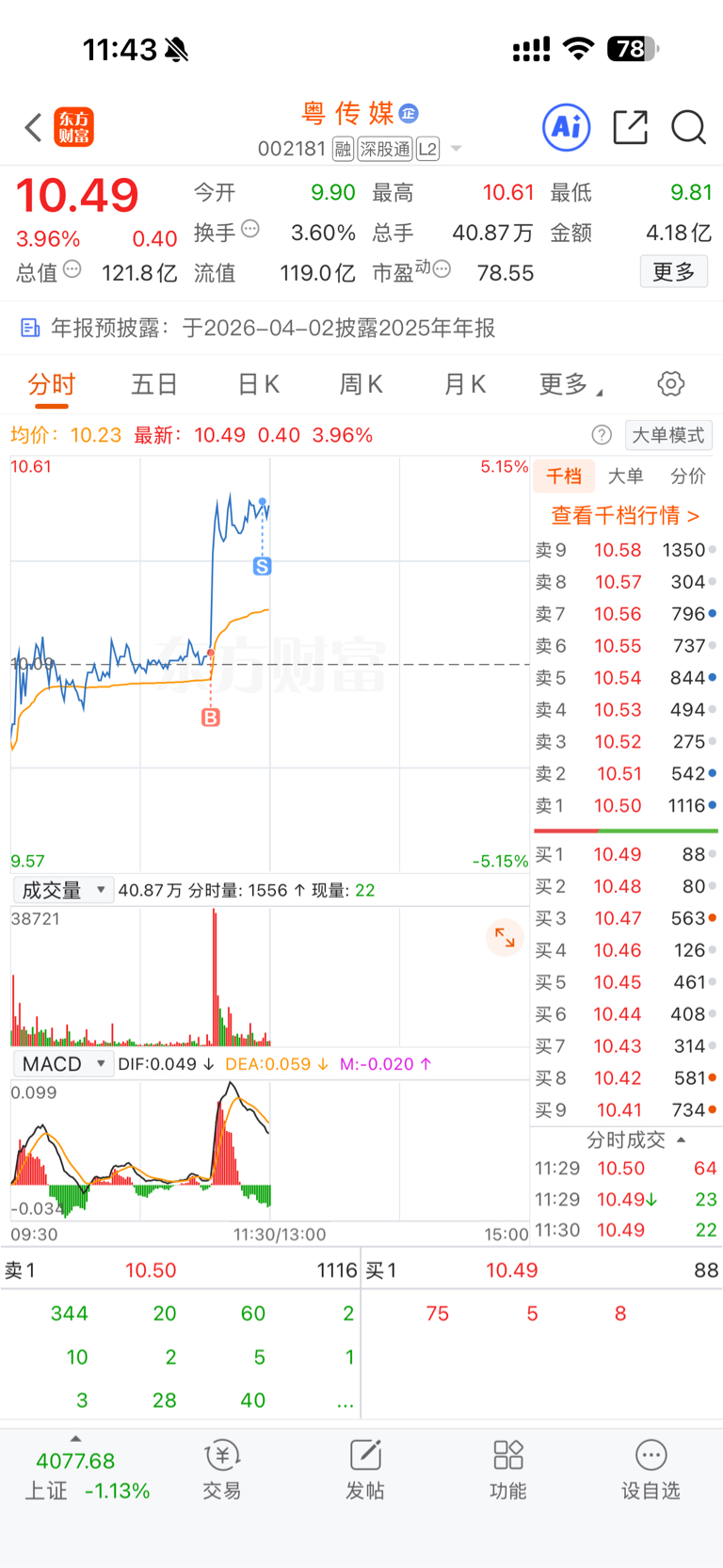 $粤 传 媒(SZ002181)$ 下午回踩再加仓!