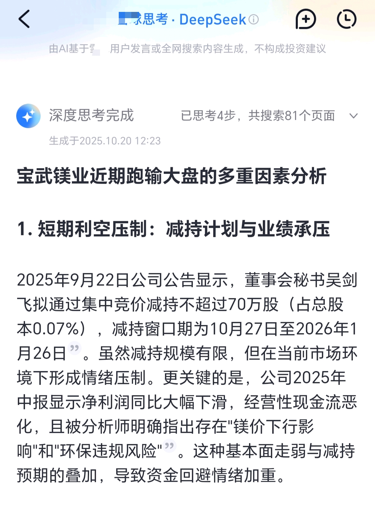 DeepSeek:董秘减持是宝武镁业股价不涨的主要原因