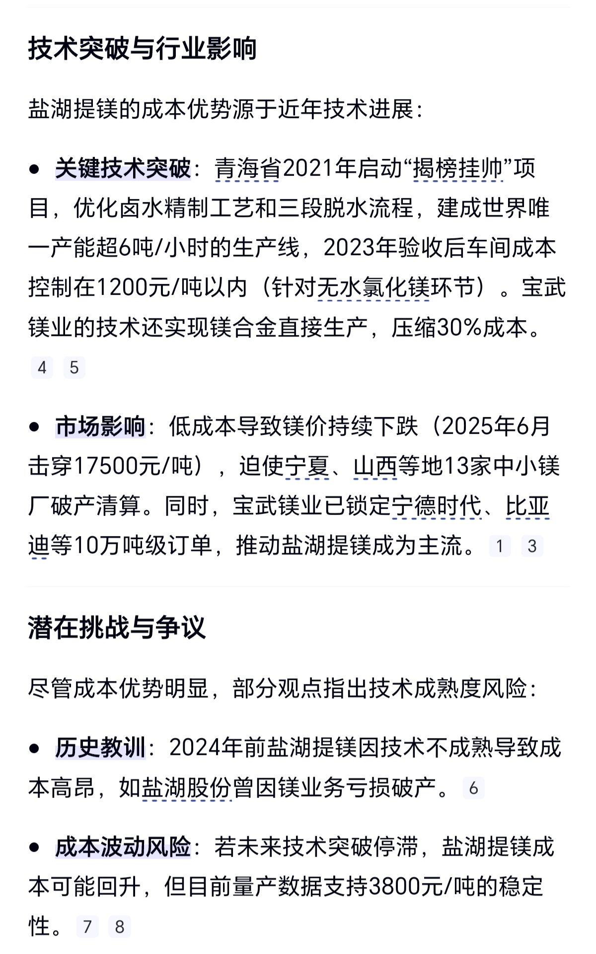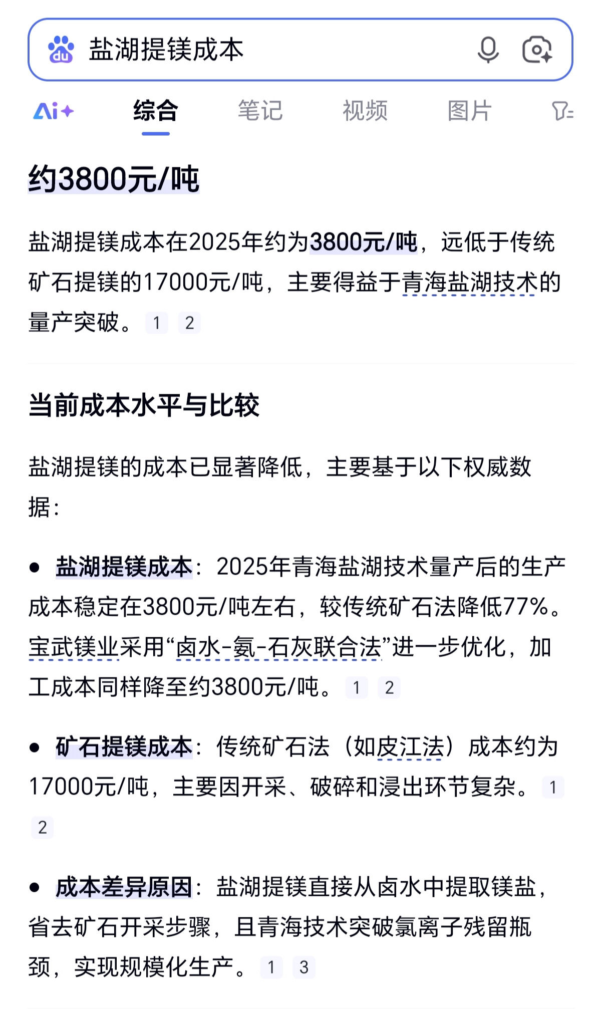 百度了一下盐湖提镁成本,每吨才3800元?如果矿石提镁成本17000元,感觉当务
