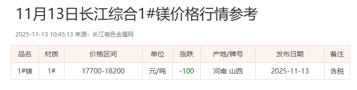11月13日长江综合1#镁价格行情参考