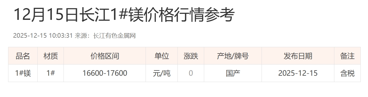 12月15日长江1#镁价格行情参考