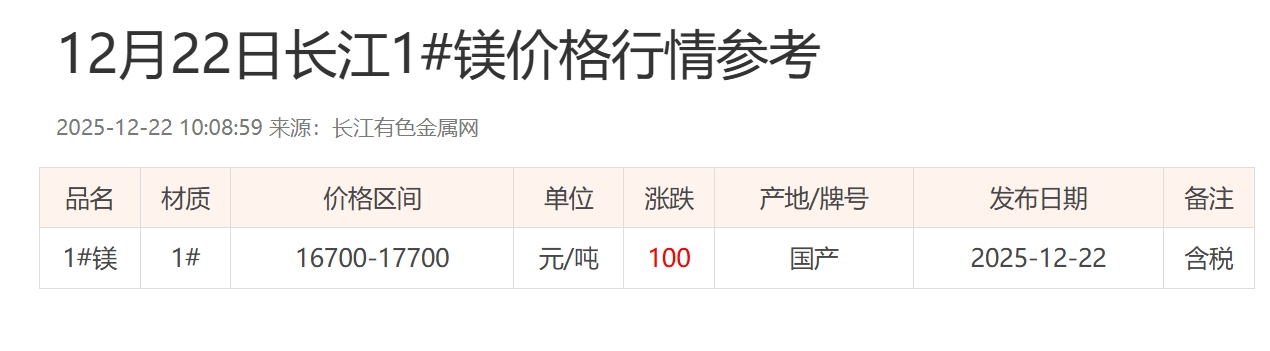 12月22日长江1#镁价格行情参考