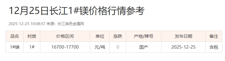 12月25日长江1#镁价格行情参考