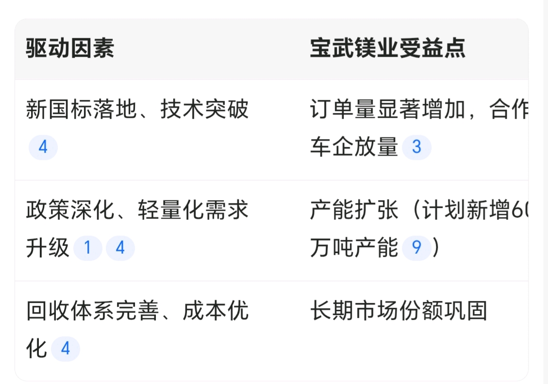 总结:宝武镁业凭借政策红利、技术领先和产能扩张,市场份额提升空间明确,未来3年市占率有望从当前不足5%跃升至30% ,成为两轮电动车镁合金领域的核心赢家。