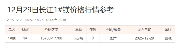 12月29日长江1#镁价格行情参考