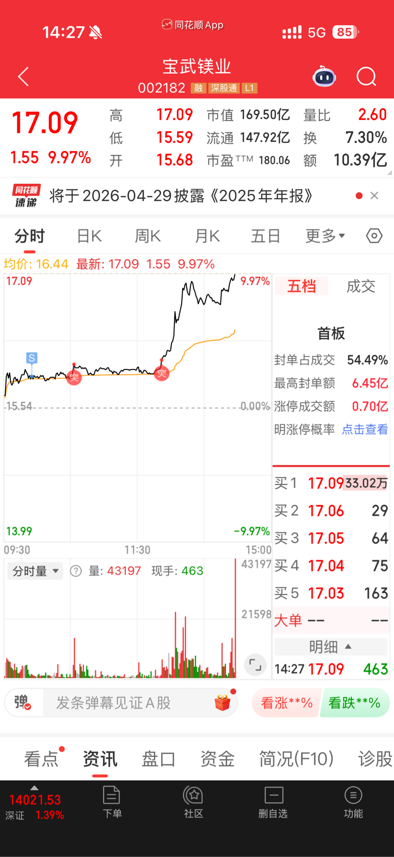 $宝武镁业(SZ002182)$ 下午出去玩了盘都没看