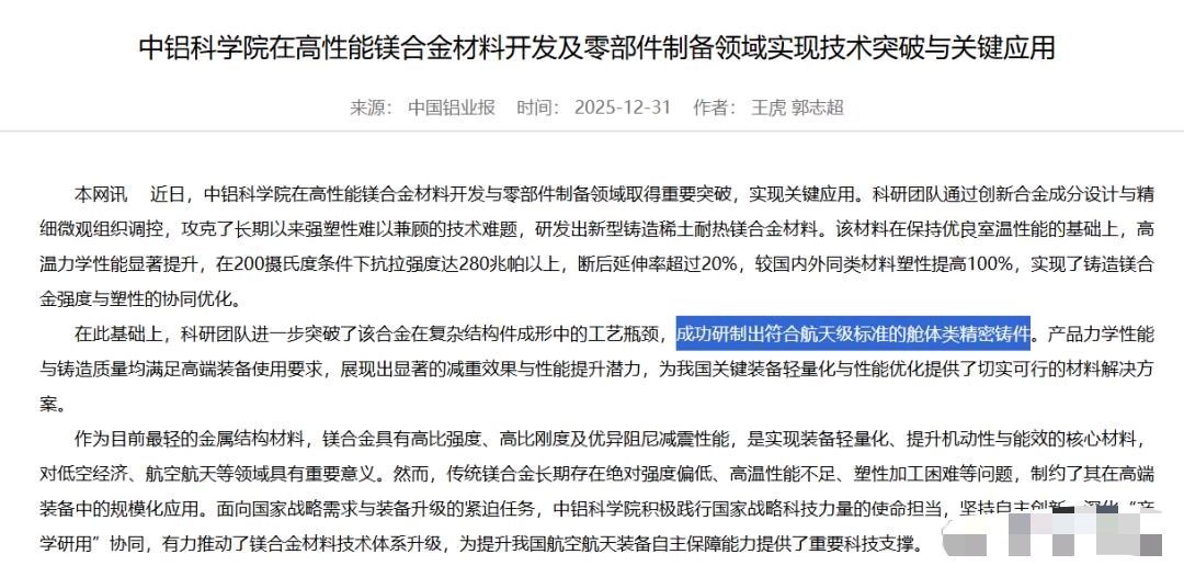 2025 年最后一天,镁合金行业传出重磅消息 —— 中铝科学院在高性能镁合金领域搞出大突破!不仅研发出又强又韧的新型稀土耐热镁合金,还搞定了航天级精密铸件,直接给航空航天、低空经济这些高端装备的轻量化 “破局”!