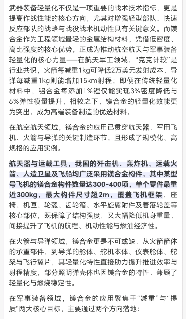 未来,随着镁合金材料改性技术的持续突破,其将在更精密、更高要求的装备制造场景中发挥作用,持续以“轻量化核心”的身份,为我国航空航天事业与国防实力提升提供有力支撑。