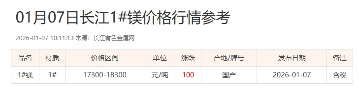 01月07日长江1#镁价格行情参考