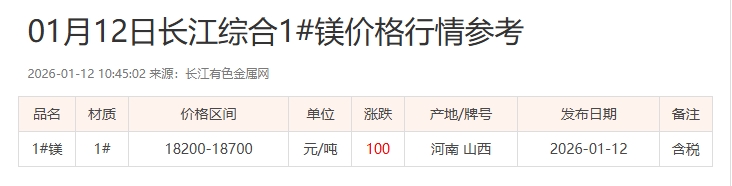 01月12日长江综合1#镁价格行情参考