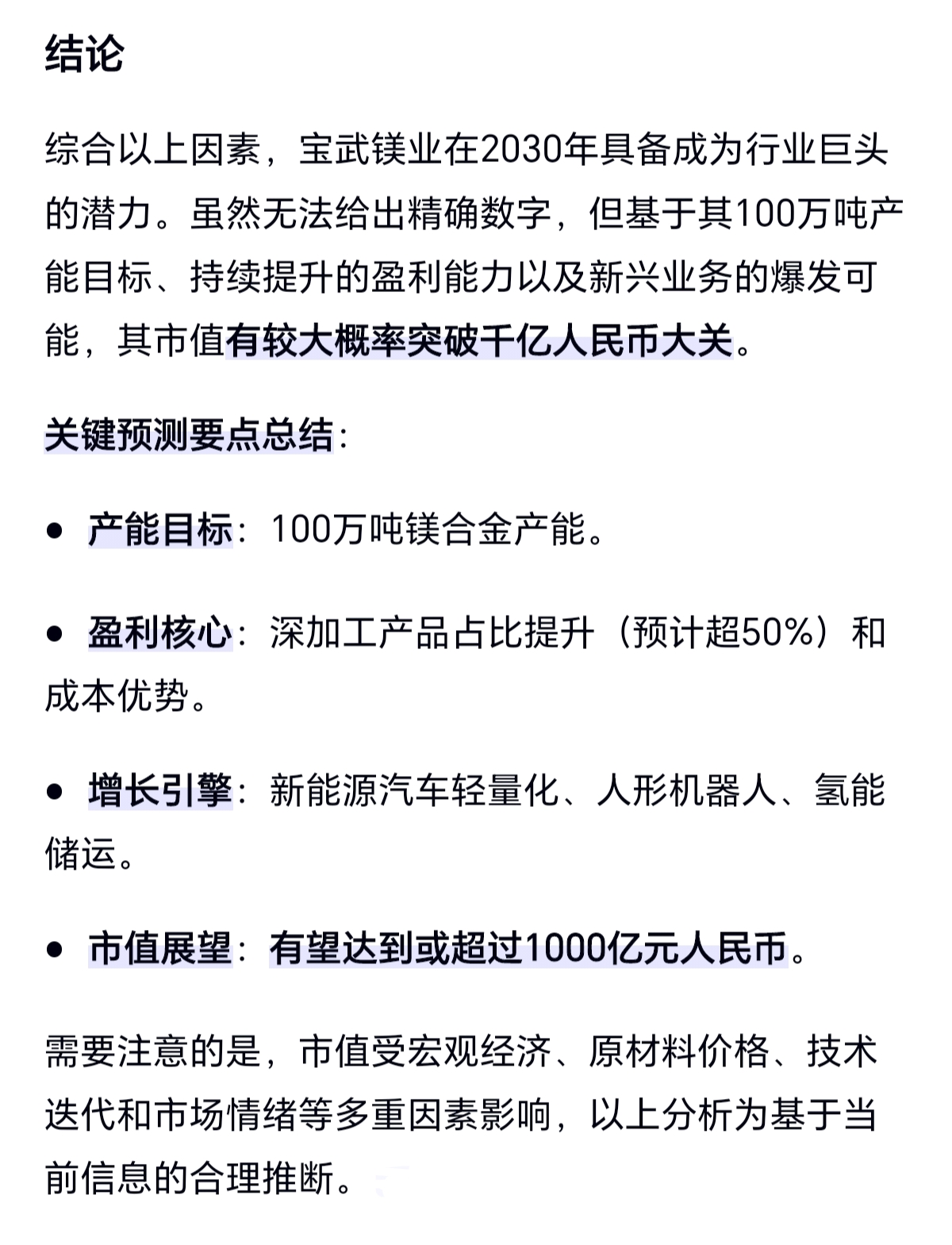 综合来看,宝武镁业的市值增长高度依赖于其产能释放、镁价回升、深加工产品占比提升以及氢能等新兴业务的突破。以下是基于现有信息的分析: