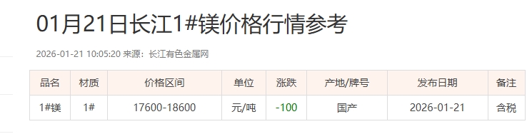 01月21日长江1#镁价格行情参考