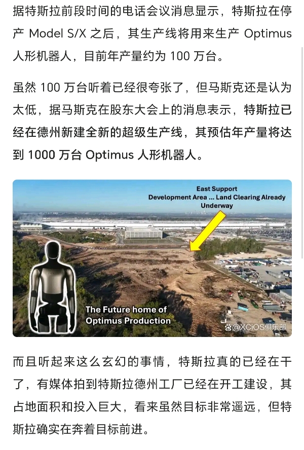 特斯拉第三代人形机器人即将亮相,在德州新建全新的超级生产线,其预估年产量将达到 1000 万台 Optimus 人形机器人