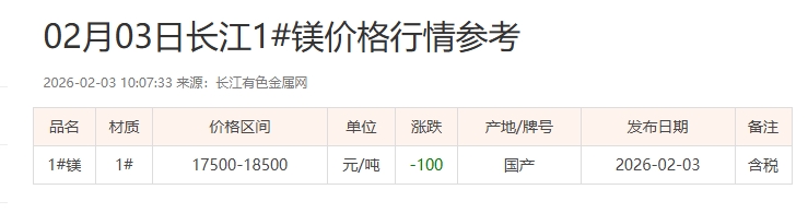 02月03日长江1#镁价格行情参考