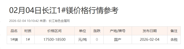02月04日长江1#镁价格行情参考
