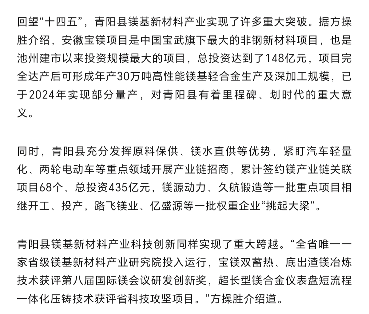 2025年,青阳县镁产业入选了安徽省县域特色产业集群培育名单,规上企业总数达到18家;镁基新材料产业研究院实现实体化运作;镁基轻合金产品中试平台获批首批工信部重点培育中试平台。青阳县还抓抢电动自行车新国标实施契机,在世界制造业大会上与长兴超威集团签约了镁基两轮电动车项目,总投资达到了117亿元,标志着镁基新材料从生产到应用、从零部件制造到两轮电动车整车迈出关键一步。