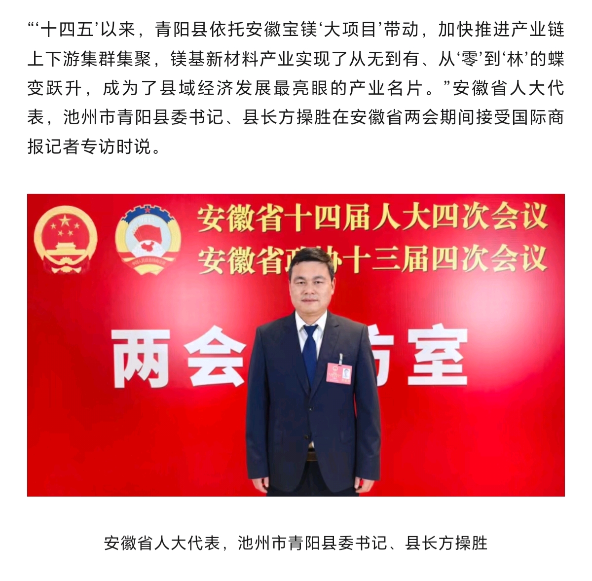 聚焦低空经济、人形机器人、氢能等战略性新兴产业,将“青阳镁”打造为池州市第二个世界级IP——访安徽省人大代表、青阳县委书记方操胜