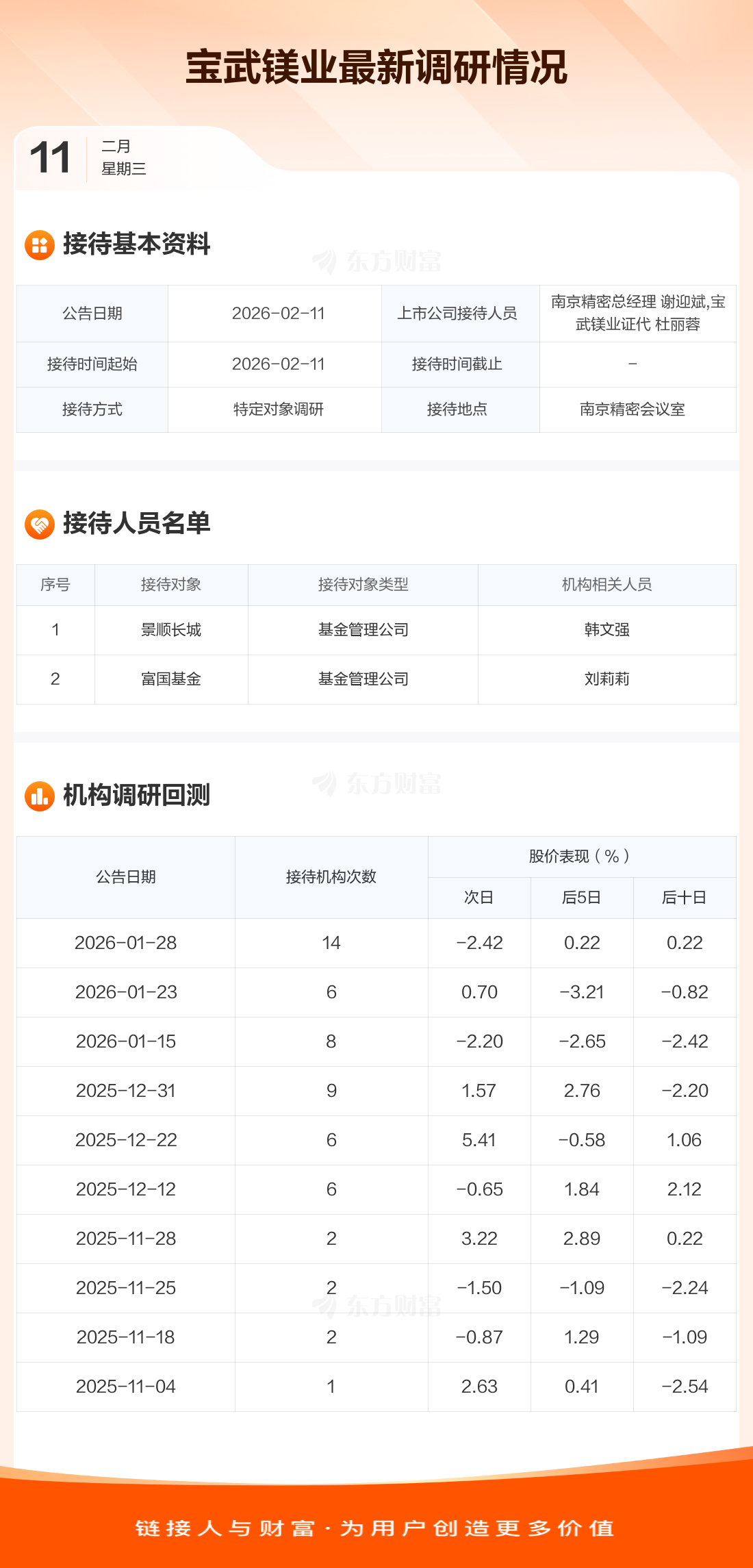 宝武镁业2月11日公告称,2月11日接待景顺长城等2家机构调研。接待人员包括南京精密总经理 谢迎斌,宝武镁业证代 杜丽蓉。