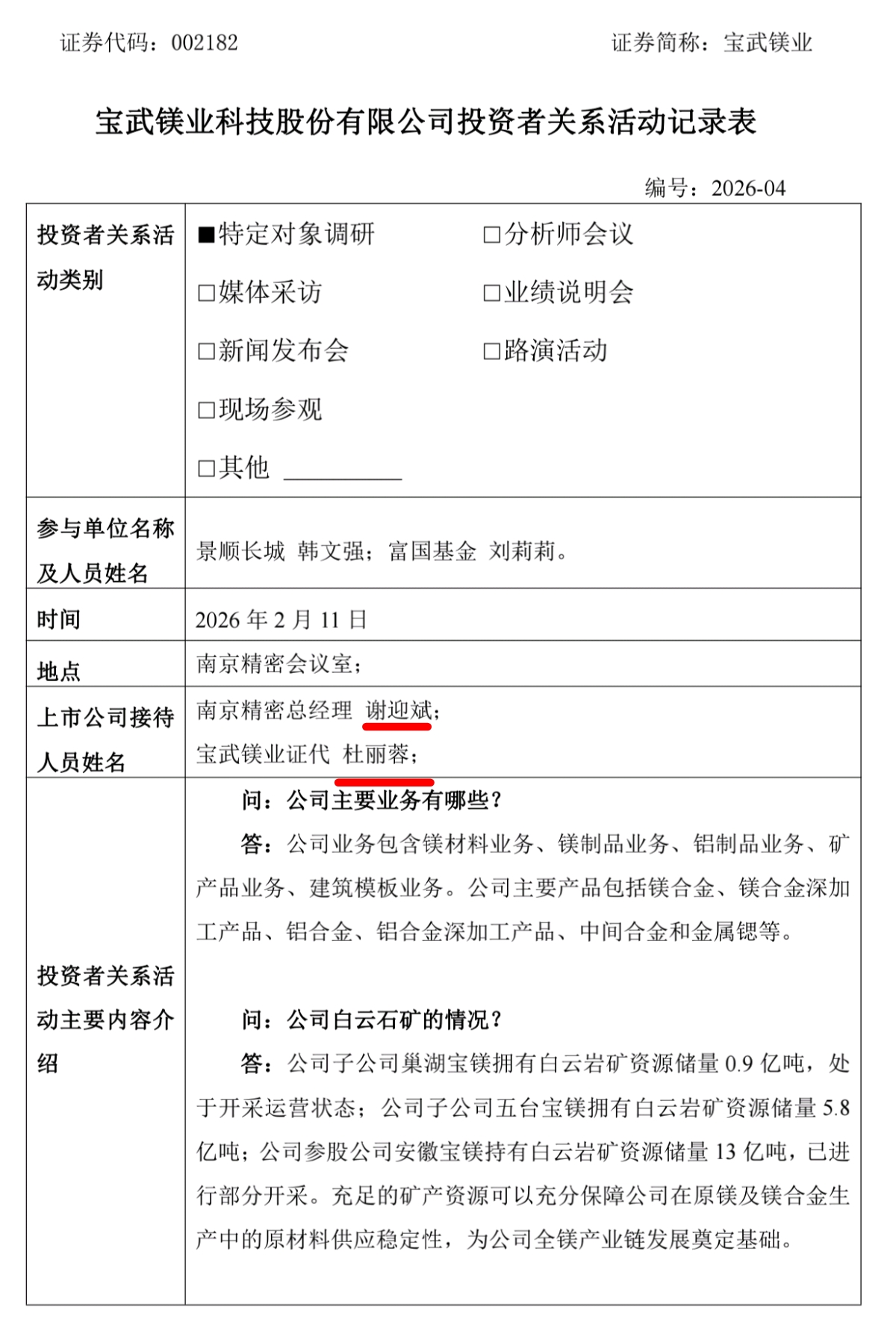 吴老太太退休了?!宝武镁业2月11日公告称,2月11日接待景顺长城等2家机构调研