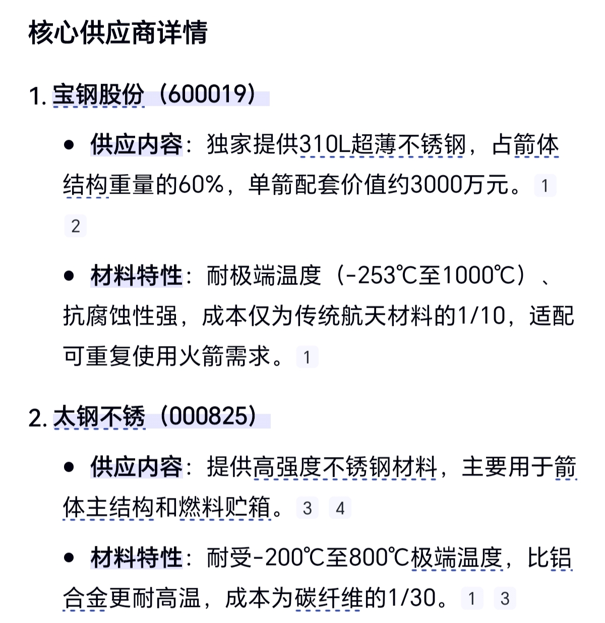朱雀三号火箭的不锈钢材料主要由宝钢股份和太钢不锈两家公司供应,其中宝钢股份提供箭体核心的310L超薄不锈钢,太钢不锈负责高强度不锈钢材料用于箭体结构和燃料贮箱。