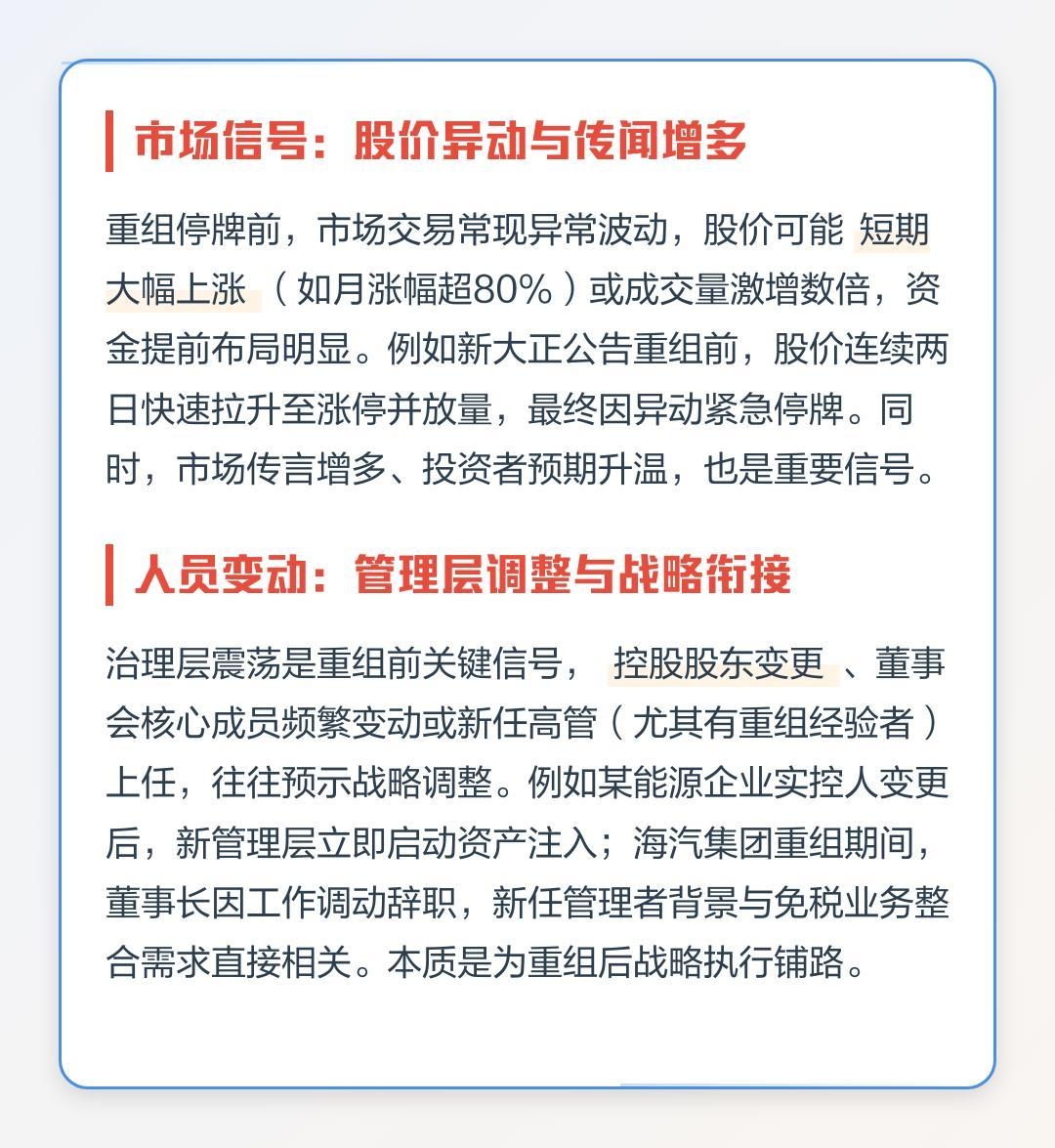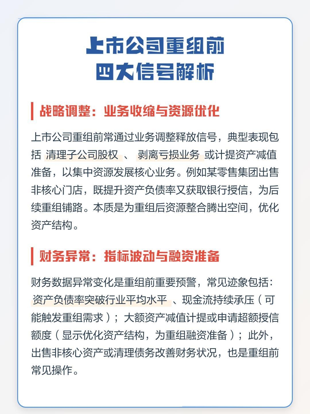 不同的上市公司在重组前的具体动作可能会因公司的实际情况、重组目的和战略规划等因素而有所差异。可以通过关注上市公司公告、财务报告以及市场动态等信息,来了解公司可能进行重组的迹象和进展。