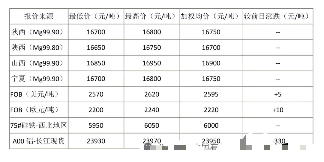 今日镁价稳定。镁冶炼企业报价坚挺,主产区多家企业17000元/吨以下不报价不出货。