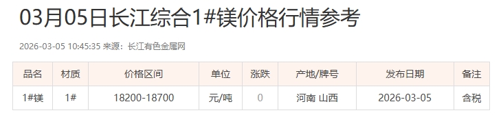 03月05日长江综合1#镁价格行情参考