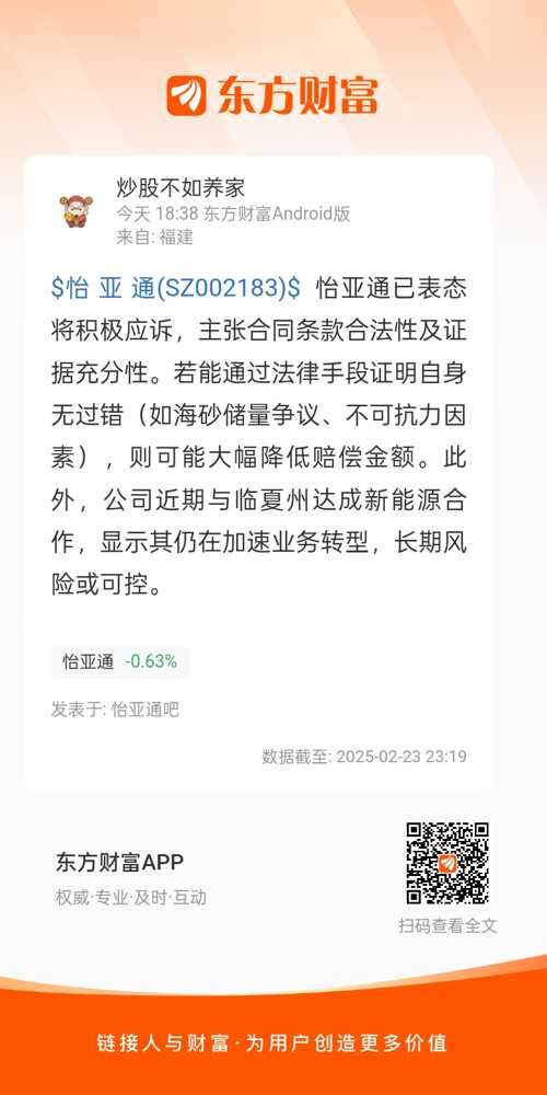 $怡 亚 通(SZ002183)$ 怡亚通已表态将积极应诉,主张合同条款合法性及证据充分性。若能通过法律手段证明自身无过错(如海砂储量争议、不可抗力因素),则可能大幅降低赔偿金额。此外,公司近期与临夏州达成新能源合作,显示其仍在加速业务转型,长期风险或可控。