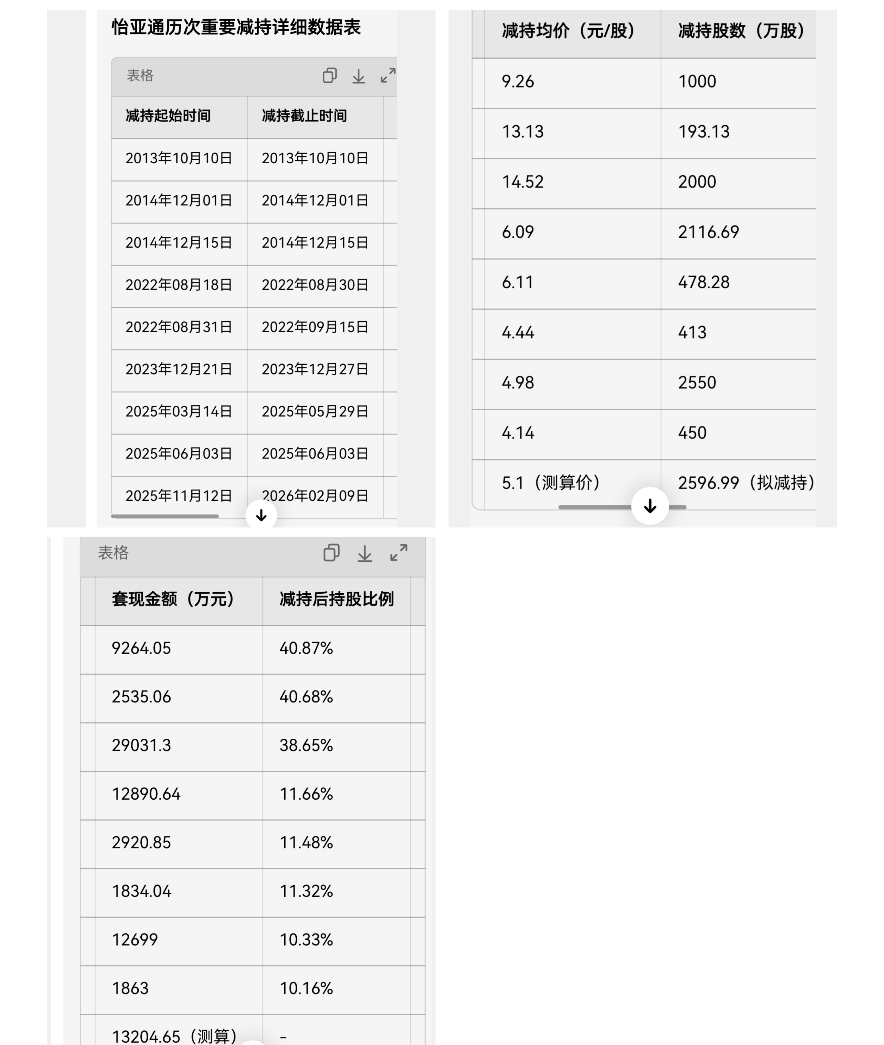 $怡 亚 通(SZ002183)$ 怡亚通历年减持记录!这是在卖公司!大股东在套现跑路!公司更换办公地址股价今天下跌???玄学ST亚通?看好就买咯