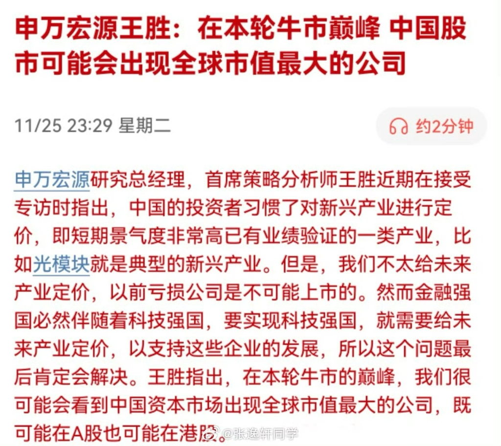 申万宏源王胜:在本轮牛市巅峰,中国股市可能会出现全球市值最大的公司。大几十万亿人