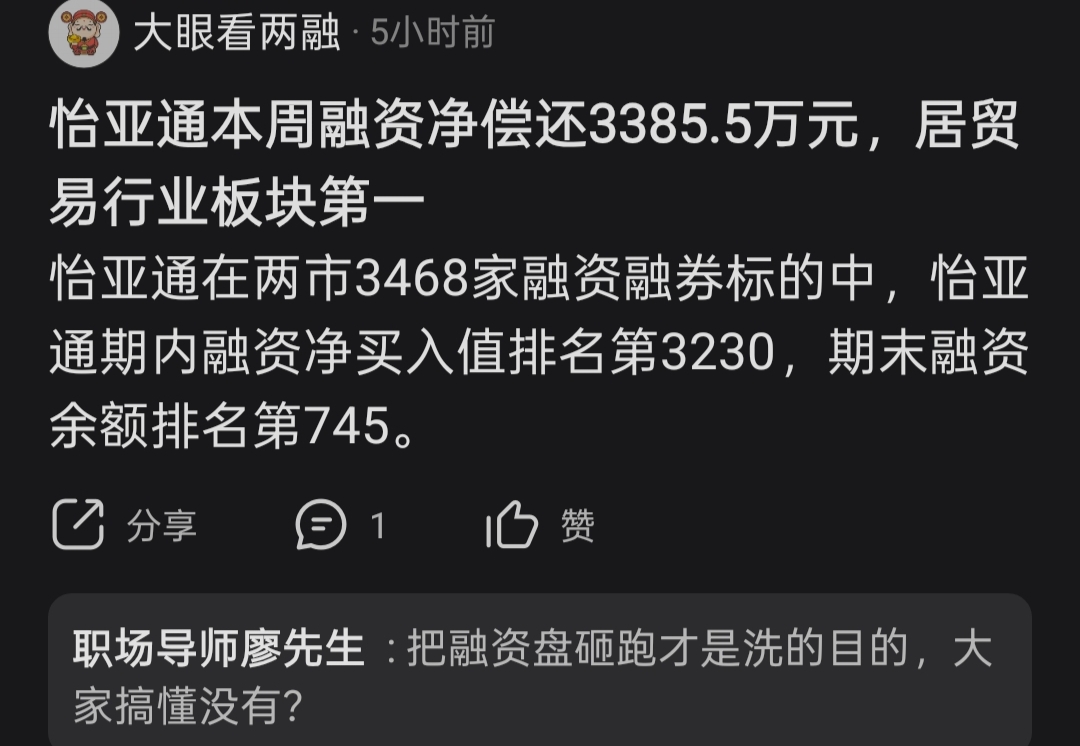 $怡 亚 通(SZ002183)$ 主力的操盘极其凶悍,不把融资盘给砸出恐慌出逃的大局面,它是不会暴涨的!话说不出公告,明天都不涨,主力还会砸吗?他心里有一本账,就是砸下去要花多少成本,容忍某些融资盘的存在,上涨的时候,他要有多少的开销。都得算账!