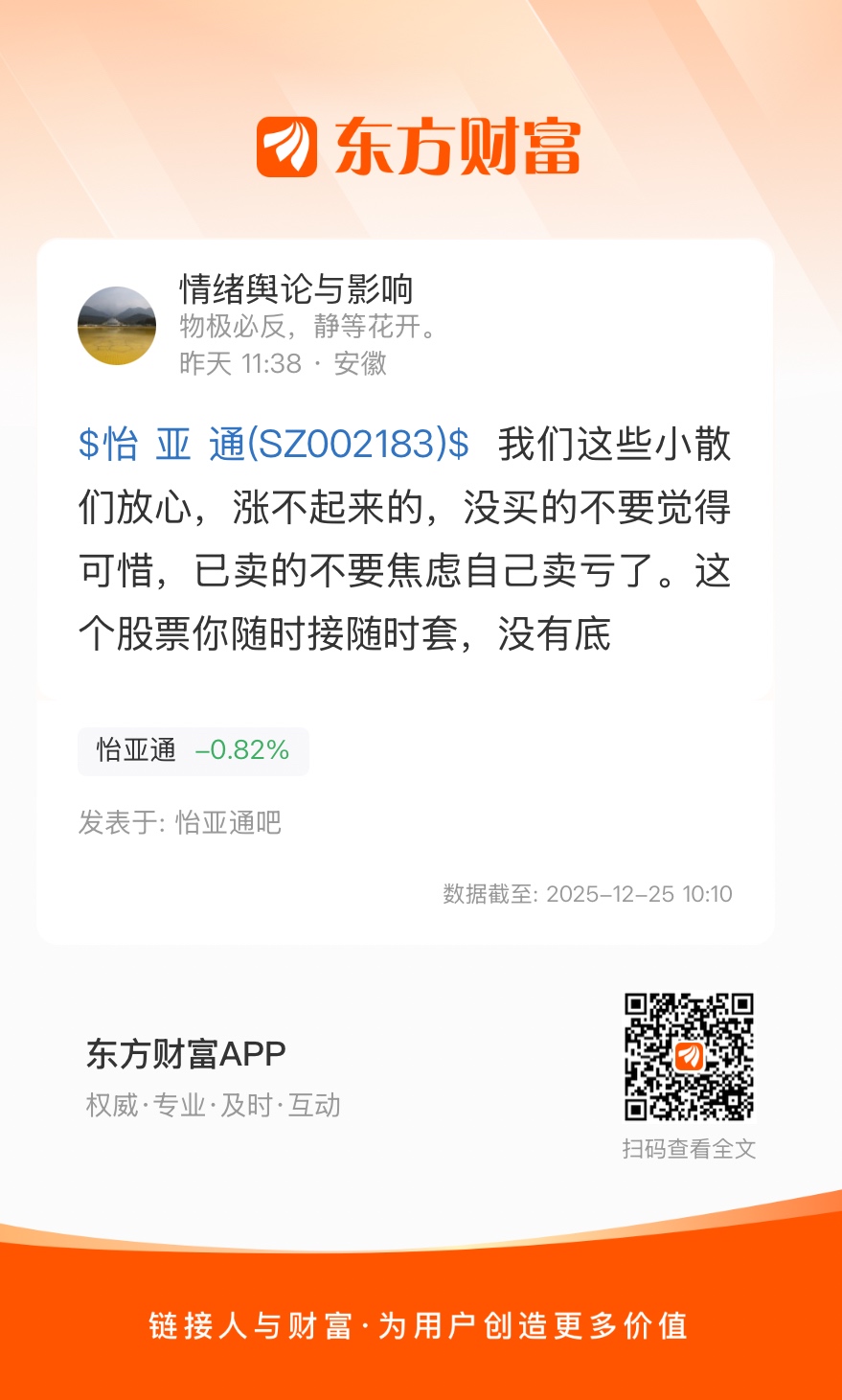 $怡 亚 通(SZ002183)$ 我们这些小散们放心,涨不起来的,没买的不要觉得可惜,已卖的不要焦虑自己卖亏了。这个股票你随时接随时套,没有底