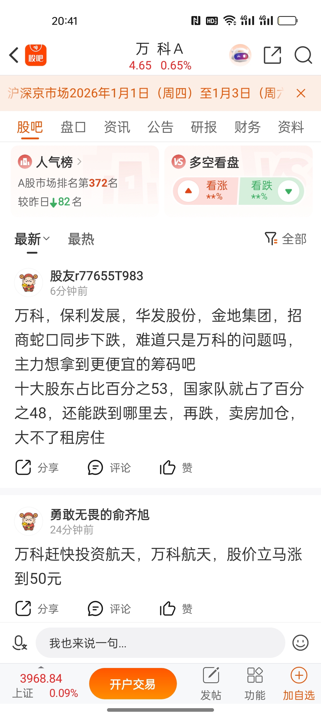 万科一年跌了35%,怡亚通比万科好多了,刚去万科股吧看了一眼,满屏看多,还有很多