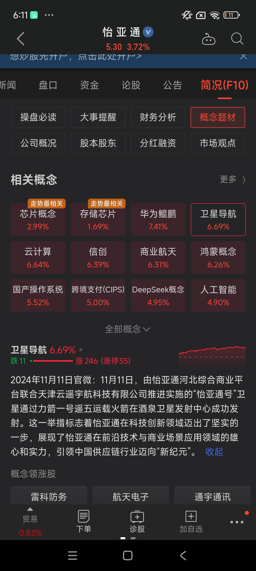 $怡 亚 通(SZ002183)$ “怡亚通号”卫星成功发射11月11日,由怡亚通(002183)河北综合商业平台联合天津云遥宇航科技有限公司推进实施的“怡亚通号”卫星搭载力箭一号遥五运载火箭在酒泉卫星发射中心成功发射。这一举措标志着怡亚通在科技创新领域迈出了坚实的一步,展现了怡亚通在前沿技术与商业场景应用领域的雄心和实力,引领中国供应链行业迈向“新纪元