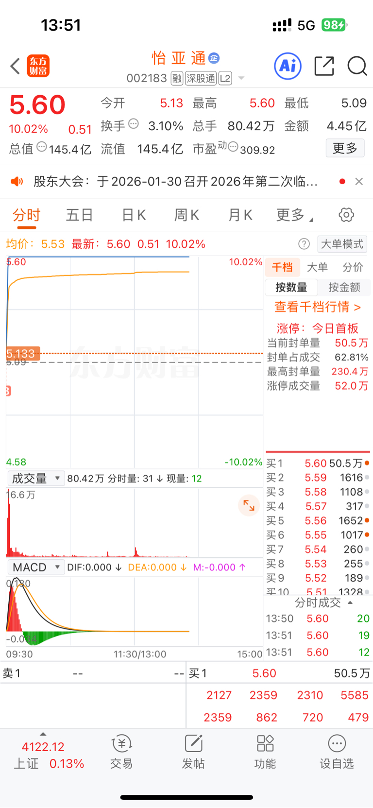 $怡 亚 通(SZ002183)$ 看好的买的少直接挂涨停价进,要是胆大全仓就好了。