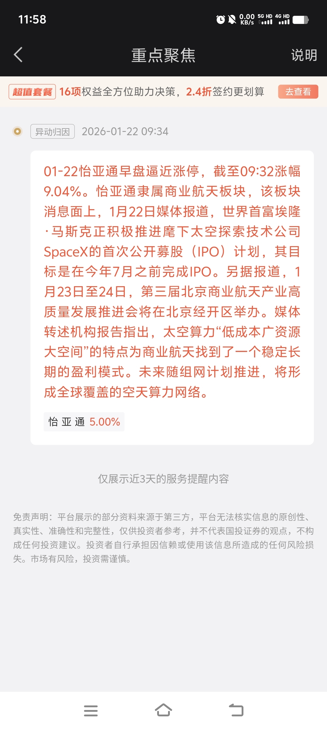 怡亚通属于商业航天,同花顺等多个软件把它放在商业航天板块!大家多去东财添加概念!