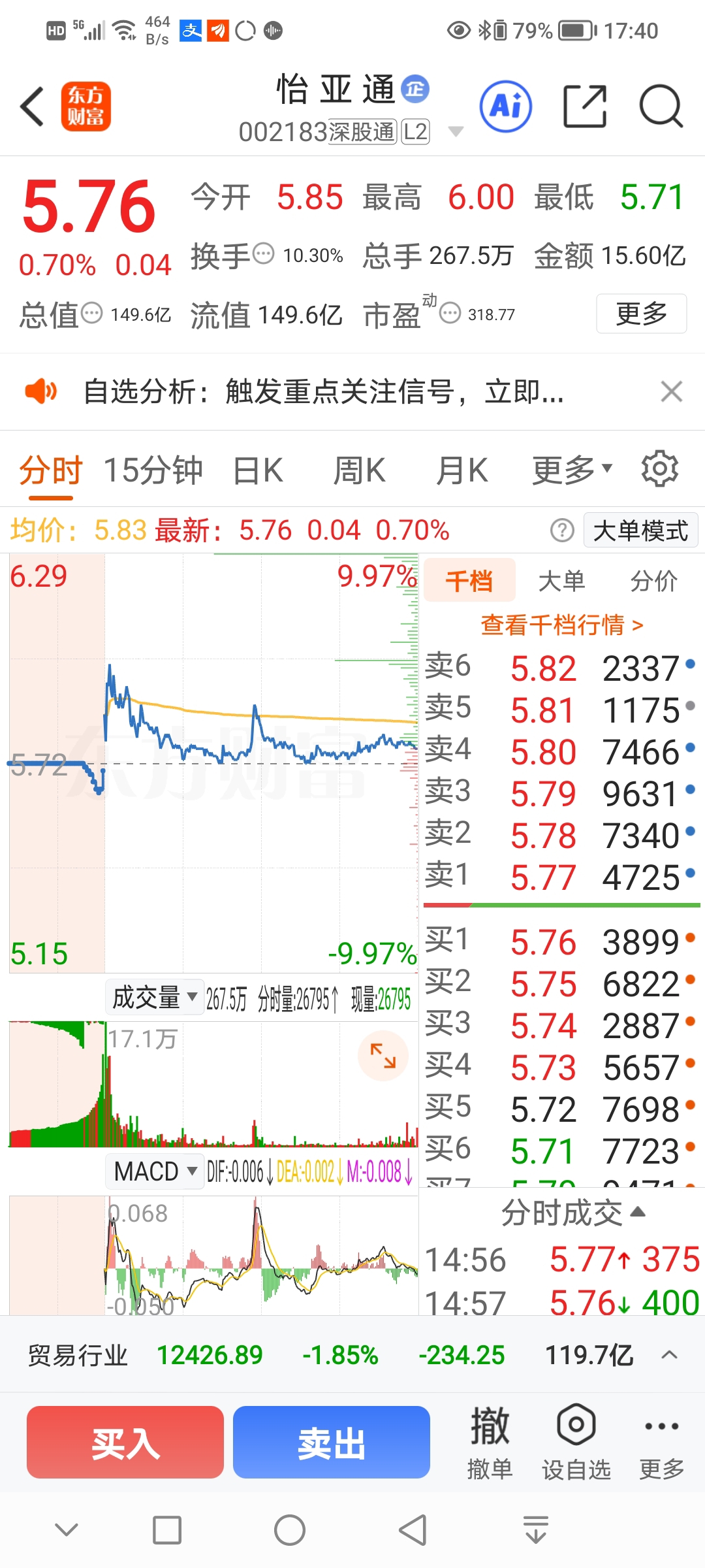 $怡 亚 通(SZ002183)$ 没有破5.71, 明天可以开干啦,明天估计高开5.82,开盘那一杀就是买入机会,,供参考