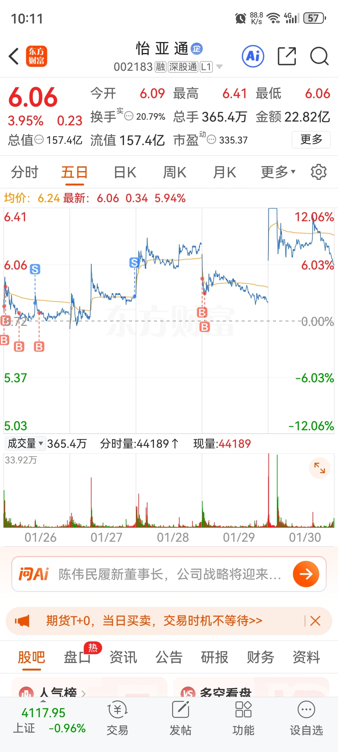 $怡 亚 通(SZ002183)$ 周五你们猜我为啥看到放量滞胀的图形为啥不跑!周一不会跌的!