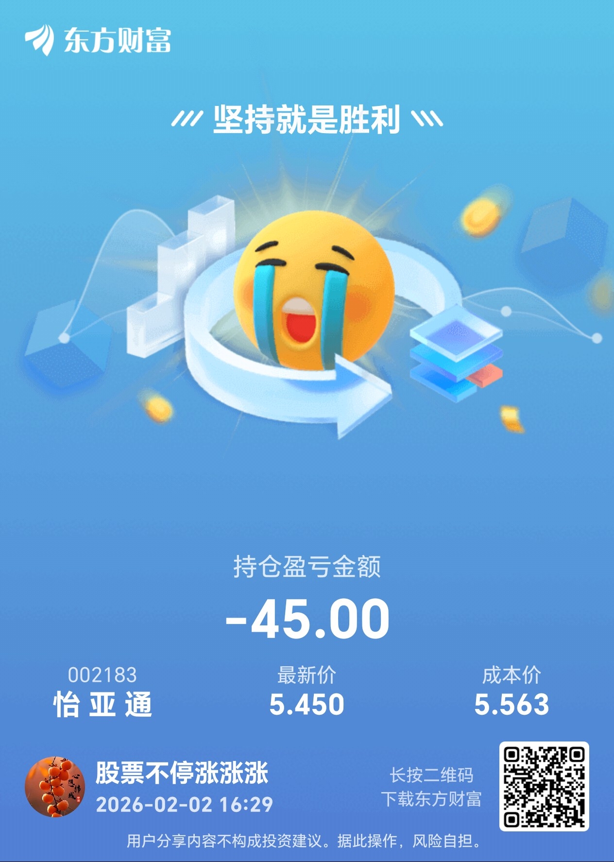 温馨提示: 1.根据《证券法》规定,禁止编造、传播虚假信息或者误导性信息,扰乱证券市场;2.用户在本社区发表的所有资料、言论等仅代表个人观点,与本网站立场无关,不对您构成任何投资建议。用户应基于自己的独立判断,自行决定证券投资并承担相应风险。《东方财富社区管理规定》