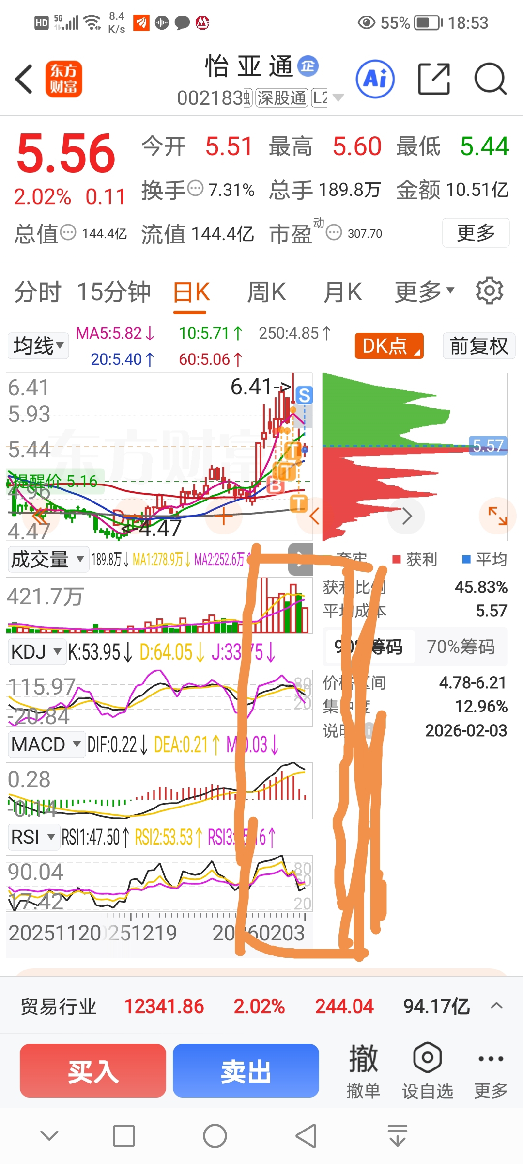 $怡 亚 通(SZ002183)$ 今天高开一个点真出乎意料,开盘后把昨天5.50~5.45割肉的又骗回来,,昨天地板今天MACD显示买盘比昨天衰竭,KDJ虽向下但还站在50之上,RSI连50都上不了,明显昨天炒底的今天又跑啦,,明天不增量就转弱真的回调啦,如真回调先看5.35支撑位吧,如触及535当天不收回535之上别接,反之可以接回,我的不破不立模式
