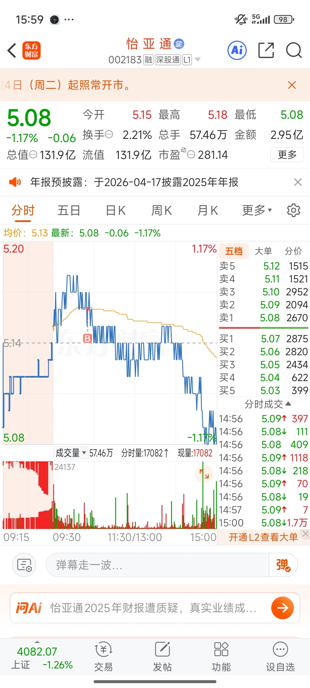 $怡 亚 通(SZ002183)$ 今日买入50万。做t已经开始,春节前最后一波恐慌技术盘。短期支撑位一到,可以搏一个小反弹。怡亚通,高抛低吸,典型。注意好仓位控制,有退市风险,但也适合高抛低吸。,通过技术位上面的分析,今天适合买入