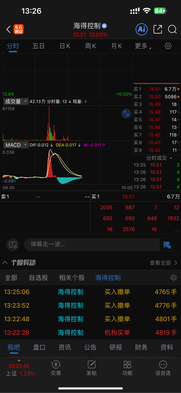 海得控制的庄家频繁挂超大单在撤单,很少见这种操作有点看不懂,没敢打板,还是选择打