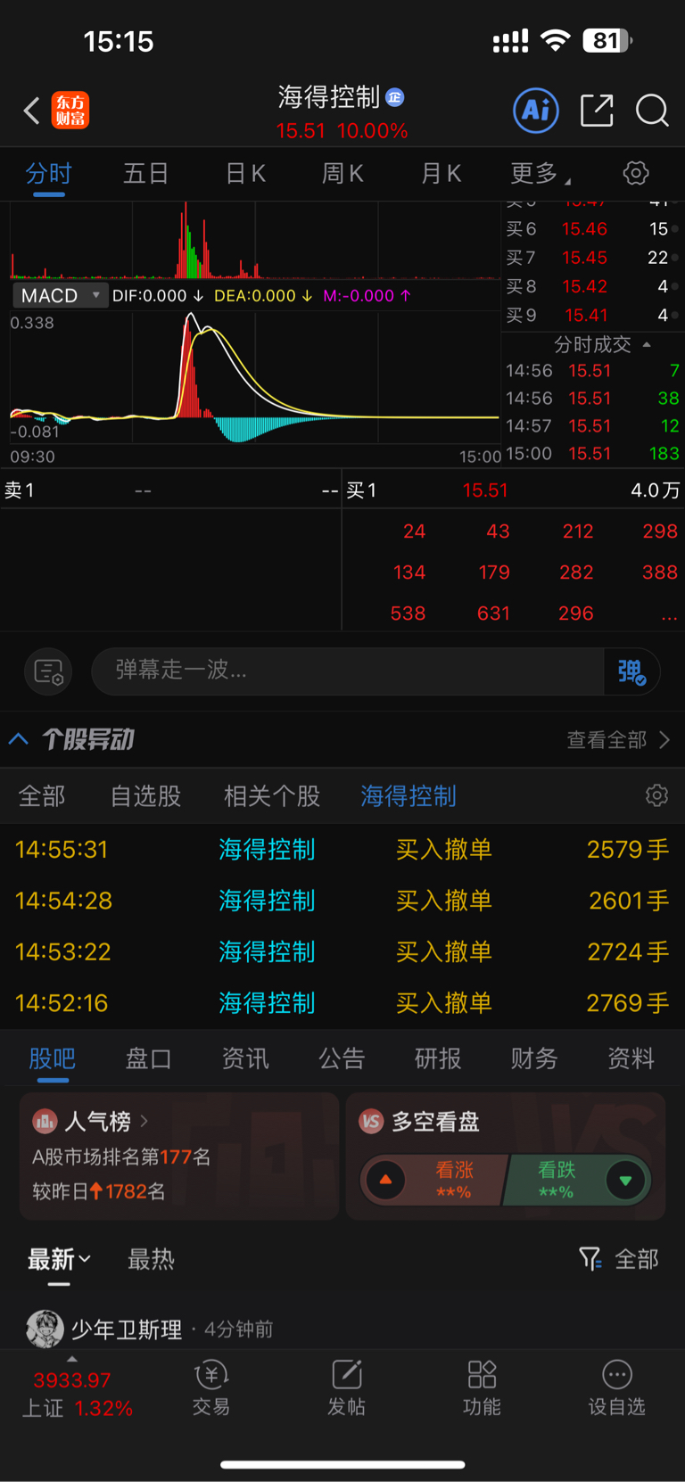 活久见了,一下午挂了上百个超大单再撤掉,奇怪就奇怪在挂的不是涨停价而是买二价,大