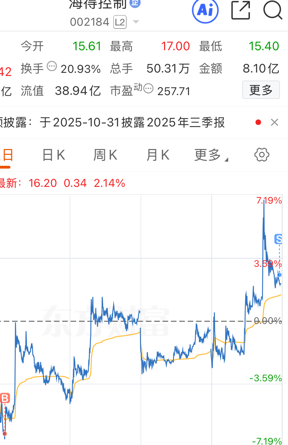 $海得控制(SZ002184)$ 上周五14.80进的格局到今天收盘16.28走了