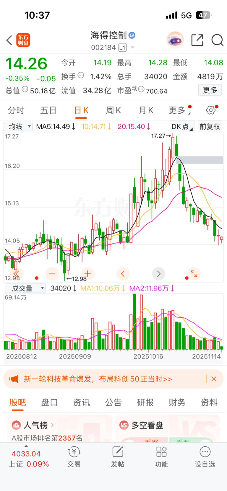 $海得控制(SZ002184)$ 股东从九月1日开始减持,然后就开始托盘,托到10月24日减持结束,仅仅第二天又装模作样的托了一天,从10月26开始喋喋不休然后放任自由下跌,这么明显的恶意操纵股价就屁事没有?我是从走势和量价配合上看到这个状态有问题,回过头来看这是赤裸裸的操纵股市啊... 兄弟们我们一起举报……
