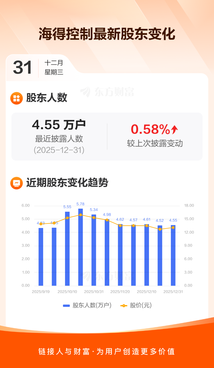 海得控制:截至12月31日最新股东户数4.55万户,较上期增加0.58%