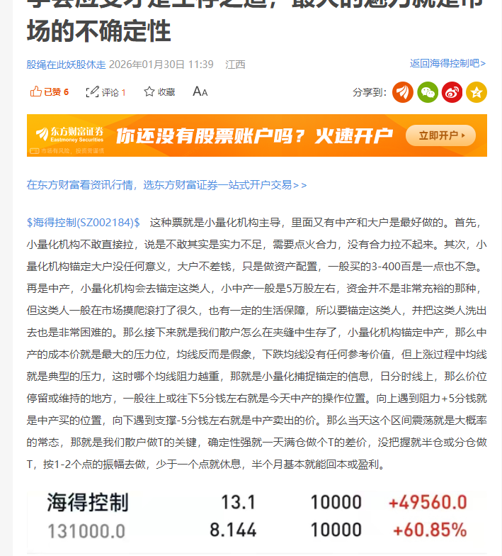 找找小量化的规律,万物都有其规律,这儿实挺舒服的,反而急涨急跌让人反应不过来,很难掌控操作。海得涨起来反而要离场,小量化资金弱,不要但心立马起飞,小盘股下跌时也别急着进,等跟市场共振是有机会就操作,海得控制到了14-15元之间虚高脱离估值反而要小心对待。