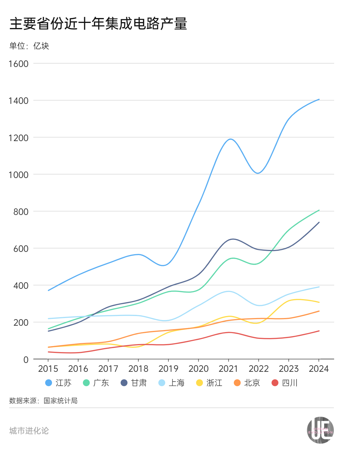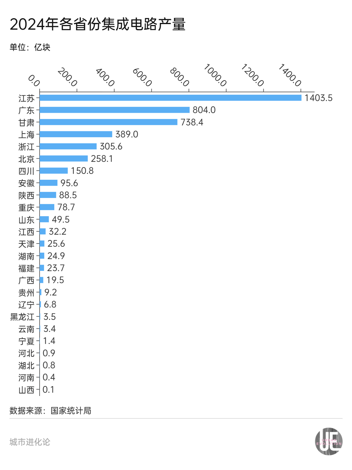 2024年,甘肃集成电路产量达到738.4亿块,仅次于江苏和广东,居全国第三,约为第四名上海的两倍。