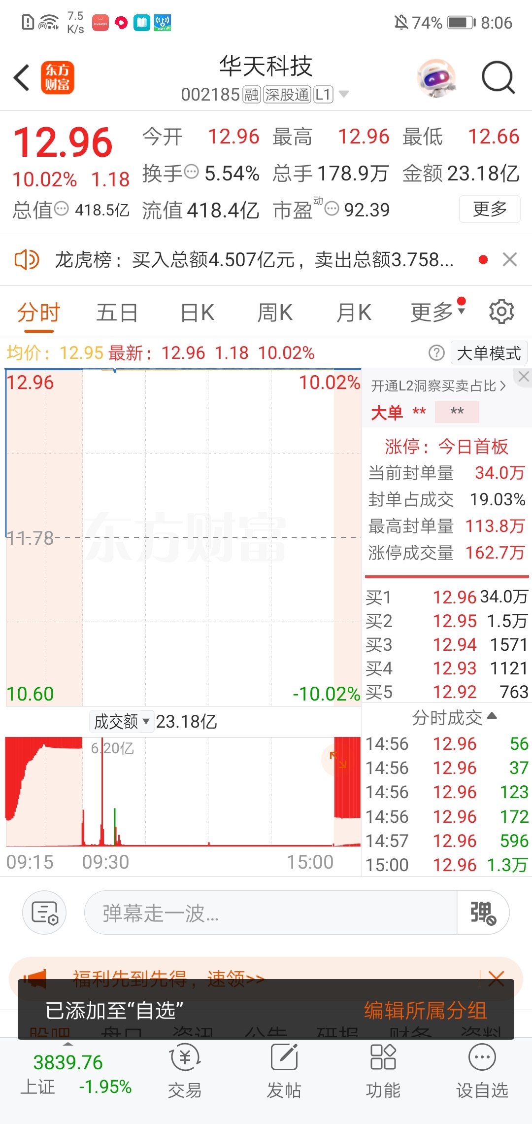 首板顶一字板,看上华天科技了,加入自选打板!感觉强庄还会拉!
